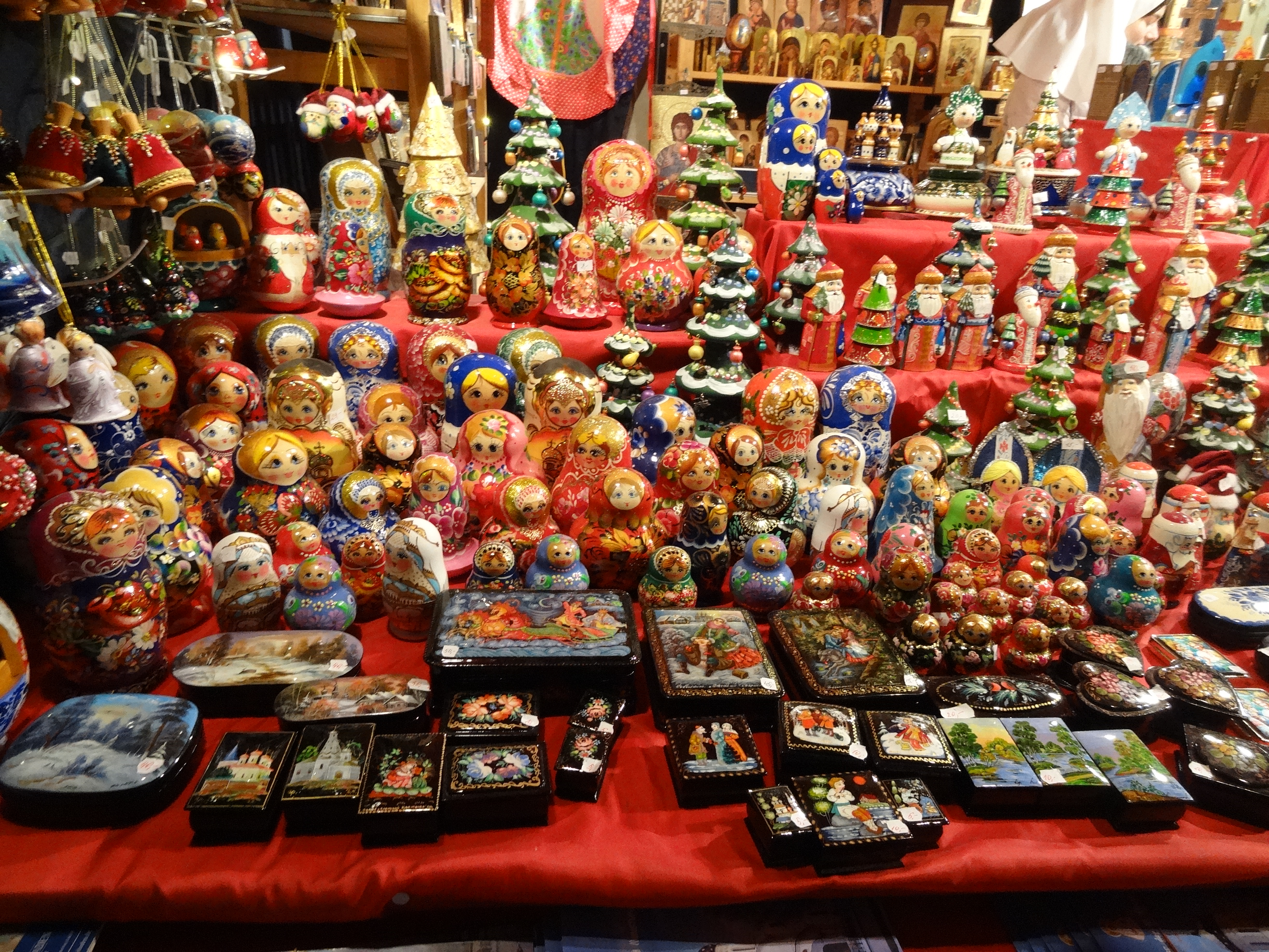 An diesem Stand kamen, zwischen einer Vielzahl von Matrjoschka/Babuschkas, richtig Kindheitserinnerungen hoch. Als Kind habe ich liebend gerne die Schachtelpuppen nacheinander geöffnet und nebeneinander gestellt. Throwback…1890 wurden die ersten Matrjoschkas von Wassili Swjosdotschkin und Sergei Maljution gefertigt. Wieso heißen Matrjoschkas, Matrjoschkas? Der Name wird – so hatte ich das gelesen – von dem typisch russischen, weiblichen Namen Matrjona abgeleitet. An diesem kleinen, süßen Stand gab es neben den schönen Matrjoschka/Babuschkas auch Jesus- und Mariabildnisse.