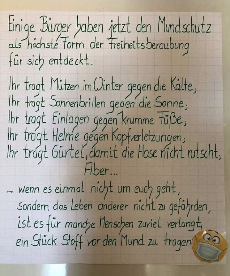 Im Endeffekt ist diese Maskenpflicht gar nicht schlecht, da sie nun mal zu unser aller Wohl ist. Und wenn wir uns alle an diese Regeln halten kommen wir wahrscheinlich oder eher gesagt hoffentlich möglichst schnell aus dieser Krise heraus. 😊