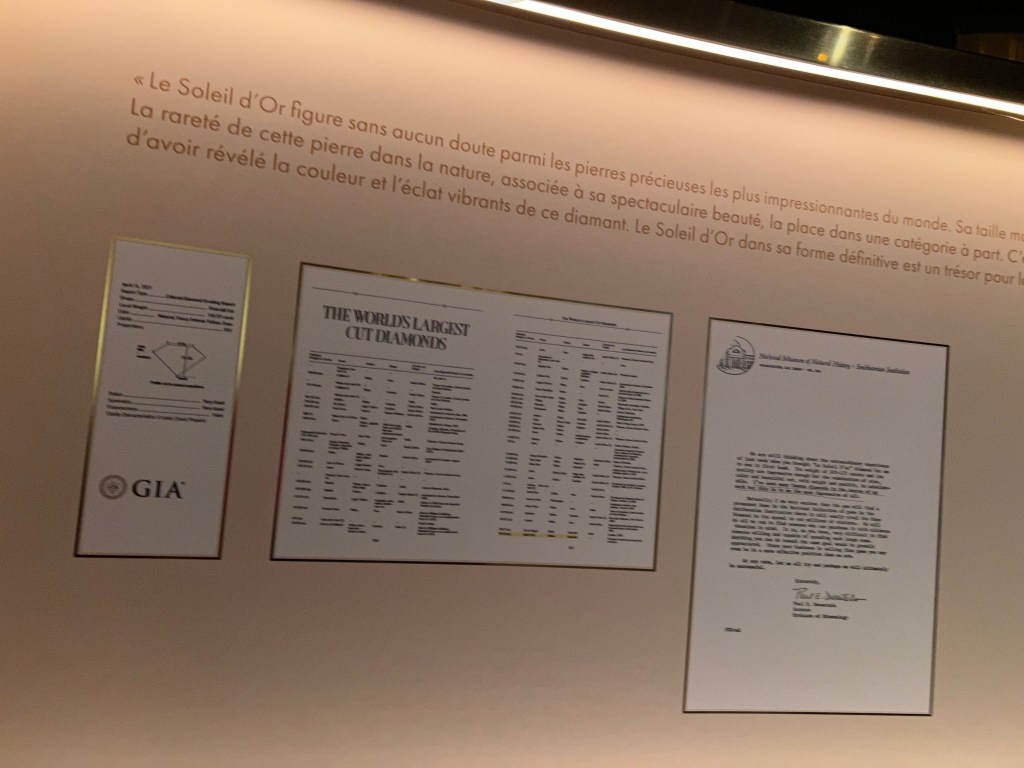 L’ouverture de l’exposition  présente le plus grand diamant 💎 – il fait 101,57 carats et  à cause de son couleur jaune il a le nom « Soleil d’Or »! Exceptionnellement par sa taille  émeraude et son poids il  a été classé parmi les diamants de plus grande taille💎 au monde.Il était vendu et re-acheté au  printemps 2021 par FRED pour des raisons de Patrimoine de la maison.