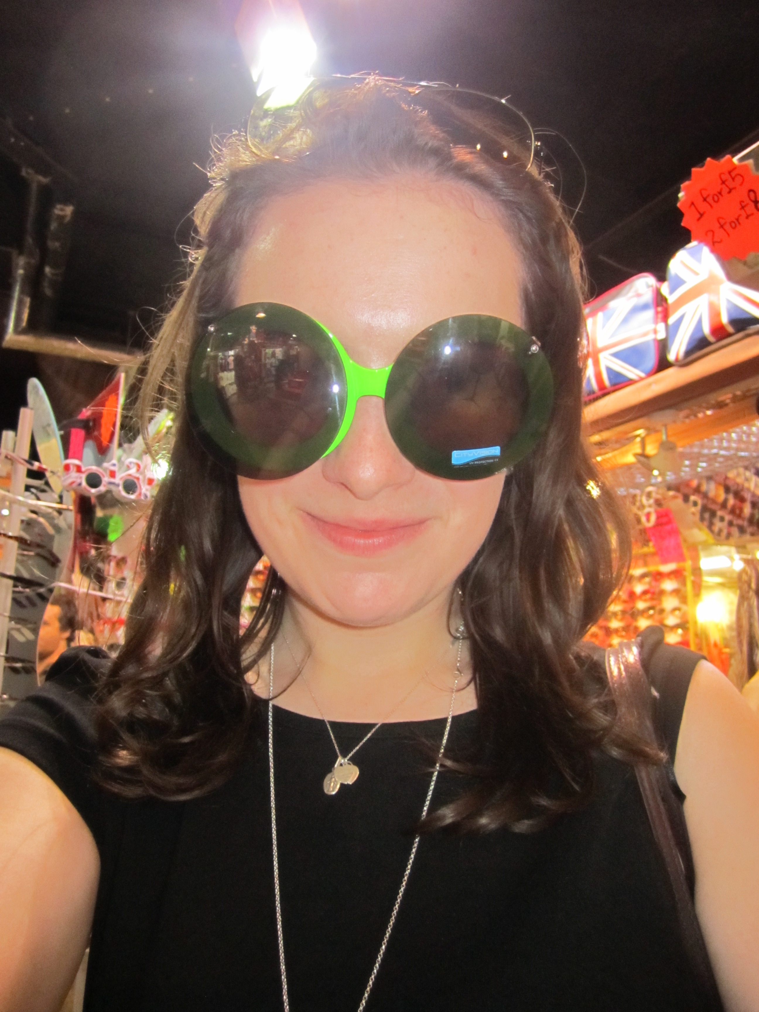 Dann sind wir weiter – auf den „Real Camden Market“. Das war wirklich spannend und super abgedreht. In einem süßen kleinen Buchladen habe ich mir echte britische Literatur gekauft. Ein sehr sympathischer Laden mit Notizbüchern, die vom Cover her auf einen Roman schließen lassen. 🙂 Richtig lustig war eine Sonnenbrille mit der ich eher wie Puck- die Fliege aussah. Aber schaut selbst auf dem Bild ;).