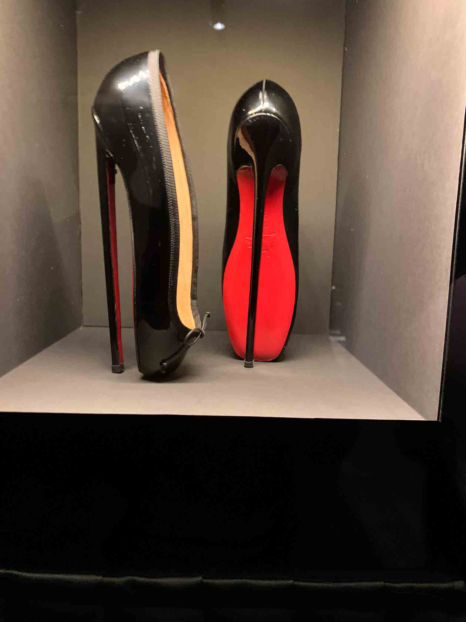 Derrière le rideau se cachaient des chaussures que franchement presque personne ne pourrait porter. Comme déco elles sont certainement très jolies et magnifiques, quelque chose à admirer mais certainement très douloureux à porter… par exemple une paire de chaussures très jolies mais avec des petites pointes ou une autre avec des petits corails. Une autre paire qu’on peut certainement porter – une sorte de ballerines avec des talons très hauts et avec les semelles rouges connues pour Christian Louboutin. De véritables ballerines peuvent certainement porter ses chaussures là. Vous pouvez aussi voir les photos avec les différentes chaussures cachées derrière le rideau… comme ça vous pouvez aussi découvrir les petits secrets derrière le rideau. 😉 Un peu plus loin il y avait des chaussures qu’ on m’a expliqué être des chaussures pour les gens avec des fétiches pour les pieds.
