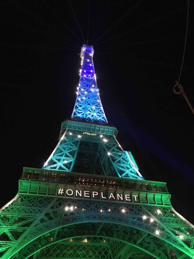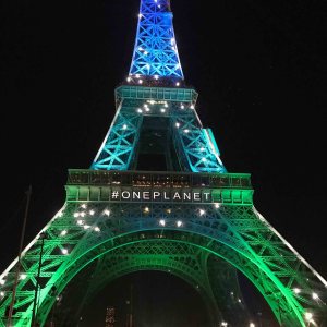 En décembre l’année dernière la Tour Eiffel a brillé dans les couleurs bleu-vert avec l’inscription ONE PLANET !