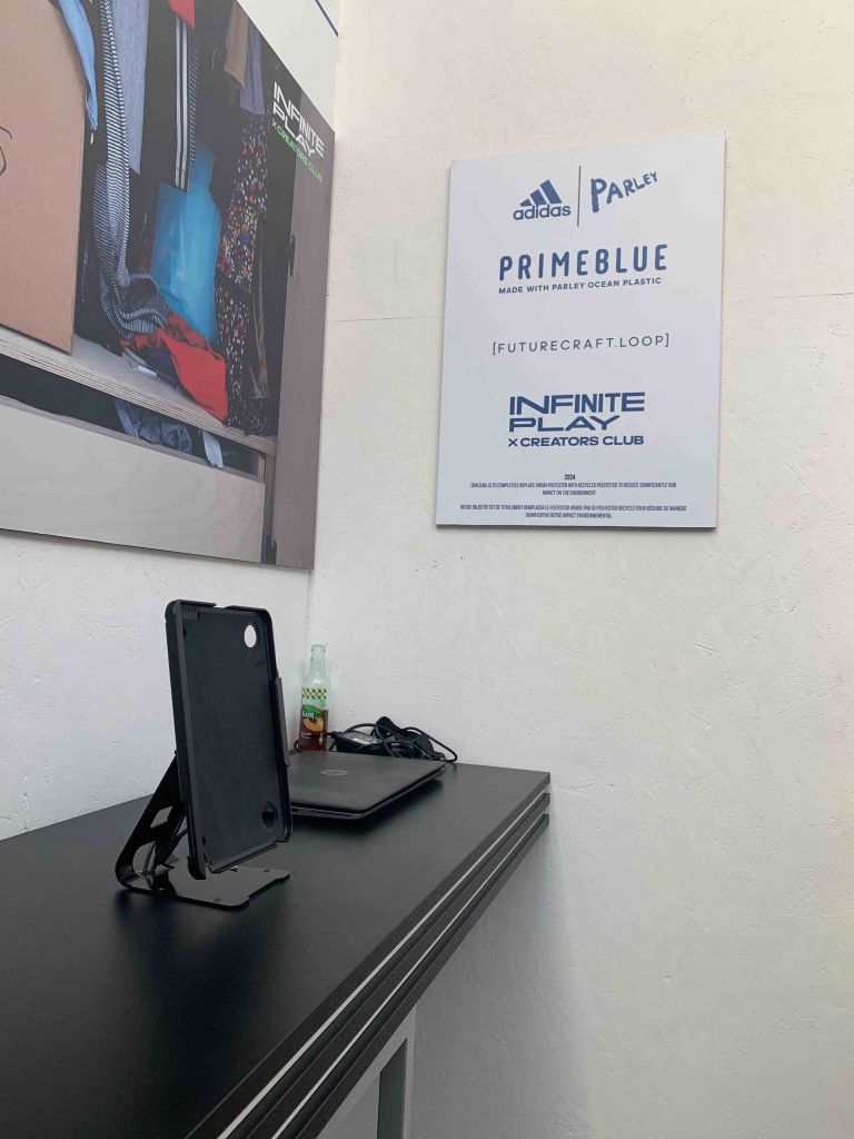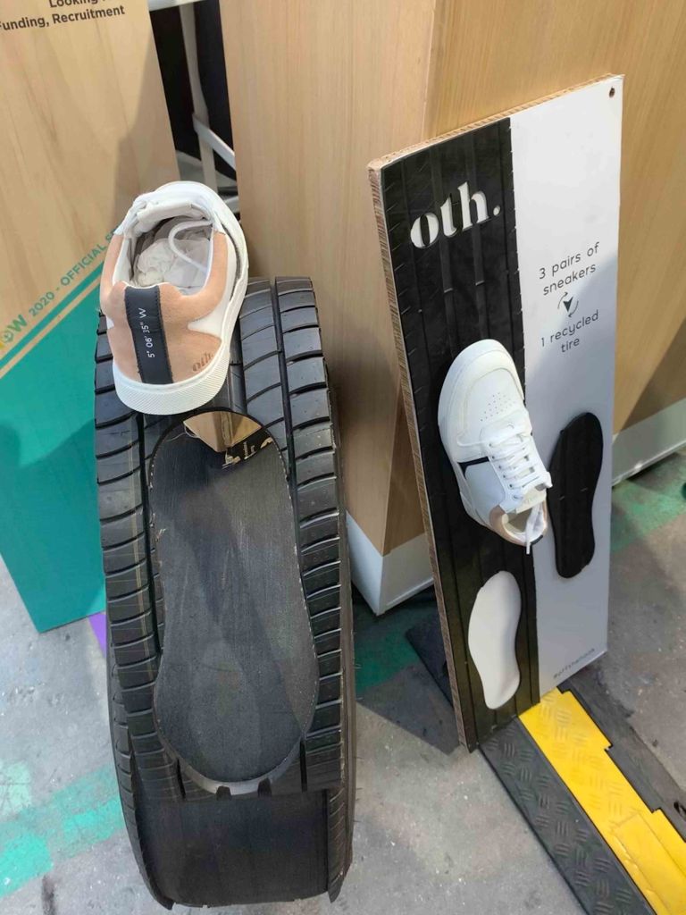 Le stand oth. présentait l’idée d’une fabrication de chaussures 👟 avec des vieux pneus recyclés. Les chaussures 👟 étaient des sneakers classiques et c’était la possibilité de redonner la vie aux vieux pneus!