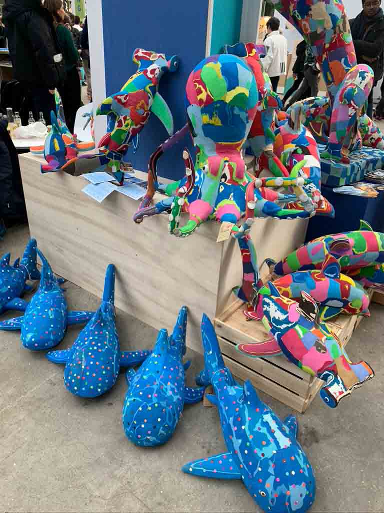 Tout de suite à l’entrée j’ai vu un stand « Ocean Sole Africa » avec des statues d’ animaux en différentes couleurs. La gentille dame m’a expliqué qu’ils sont fabriqués au Kenya 🇰🇪 . Les gens peuvent travailler à plein-temps ou mi-temps. L’idée est merveilleuse. Les gens au Kenya🇰🇪 reçoivent la possibilité de travailler et de fabriquer de grandes pièces d’art. Un point important et intéressant est qu’ils collectent les Flipflops que les gens ont oublié et qui peuvent finir dans l’océan et dans les cours d’eau. Avec des Flipflops trouvés ils fabriquent de véritables pièces d’art uniques. Elle m’a expliqué que les prix dépendent du temps de fabrication. J’avais le coup de foudre pour ces status, mais mon appartement est malheureusement trop petit même pour les petites statues. . Ce qui m’a beaucoup plu le plus est le mélange de social et d’engagement pour l’environnement.