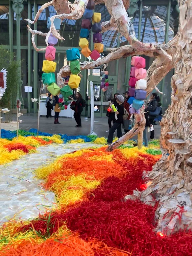 A côté du premier stand il y’avait que un grand arbre 🌳 avec une pelouse colorée et des tournesols 🌻 fabriqués avec du papier journal 📰. L’arbre n’était pas seulement un arbre. Il y’avait des petits cubes colorés où les gens ont la possibilité d’écrire leur promesse à la nature déçue. L’abre se trouvait dans une petite antre dorée où on avait la possibilité d`écrire ✍️ quelques mots et mettre ce cube sur l’arbre. L’arbre 🌳 avec les petits cubes, la pelouse colorée et les tournesols 🌻 donnaient une ambiance magique. L’artiste talentueuse s’appelle Rachel Marks.